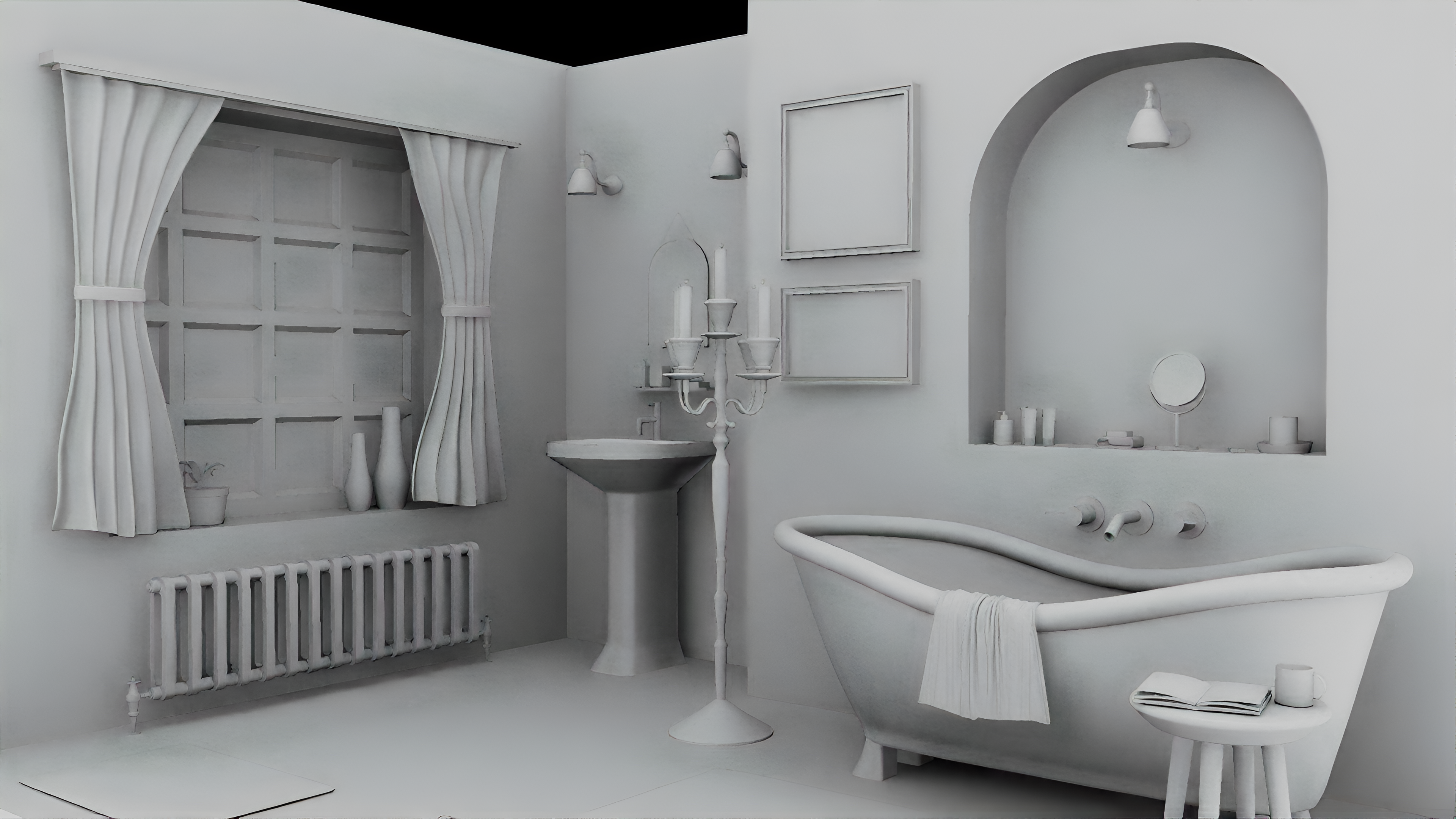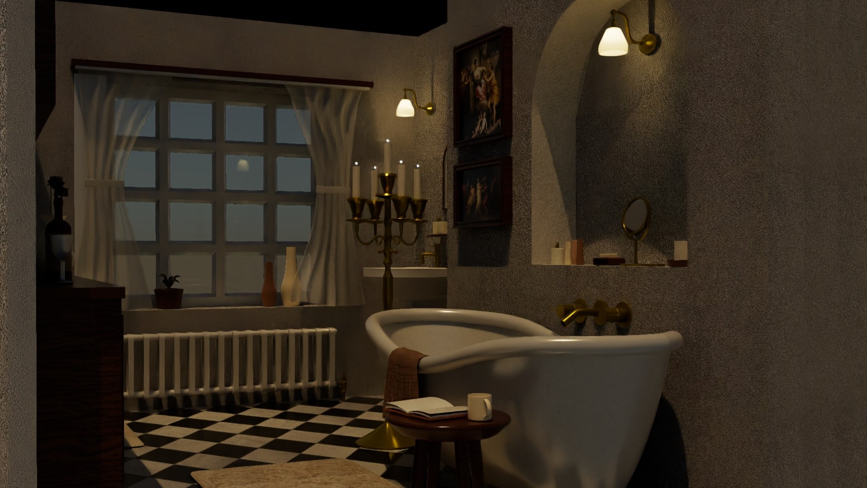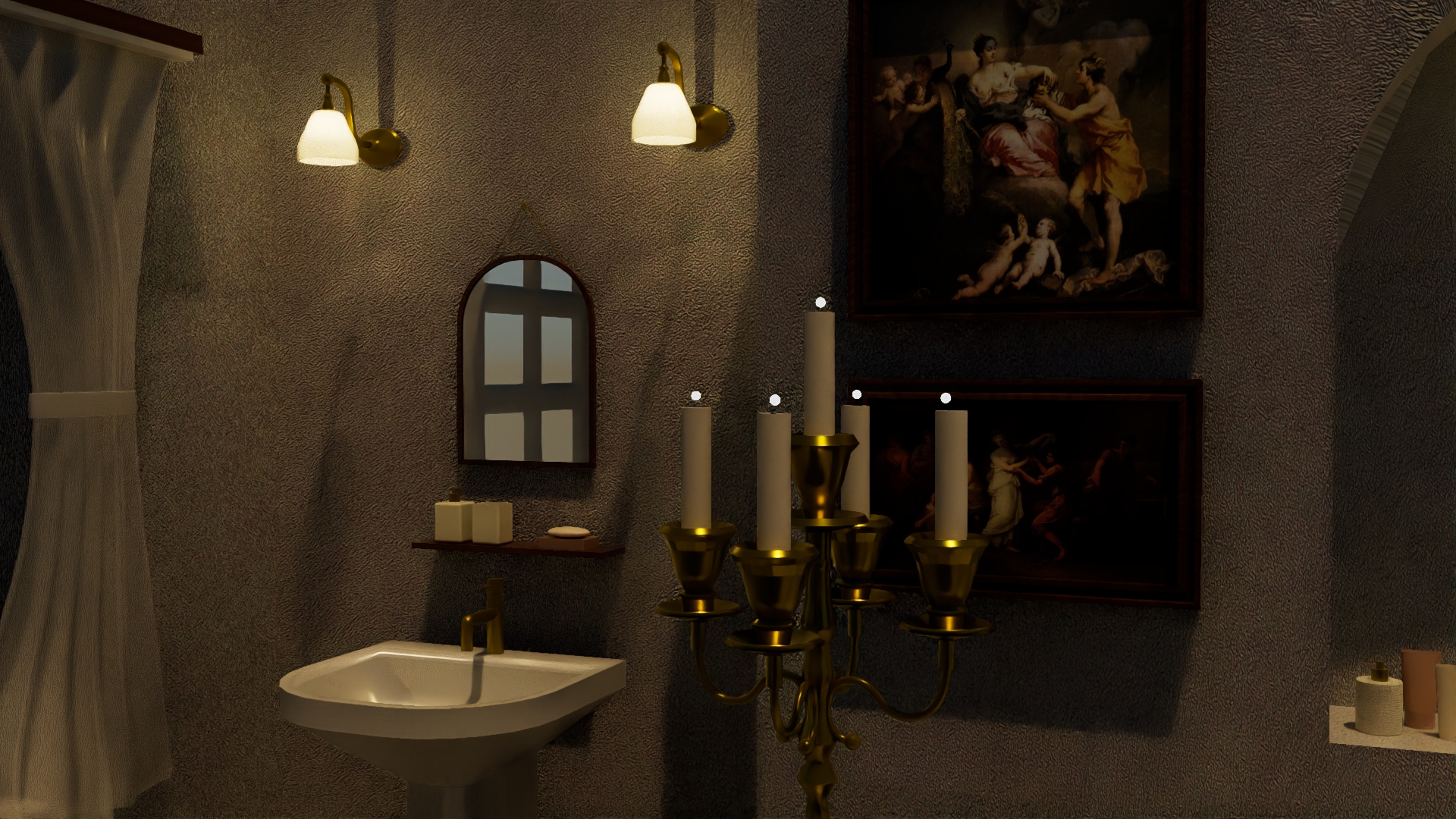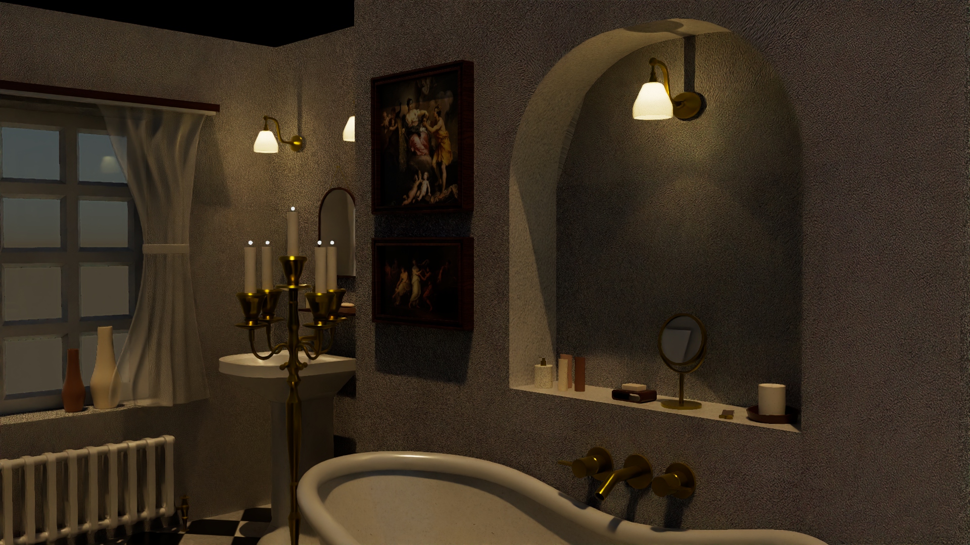 A 3D bathroom designed using Autodesk Maya, in the timeless Victorian style, incorporating hallmark design features of the era such as intricate fixtures resembling candle stands, vintage tiles, and a grand bathtub.