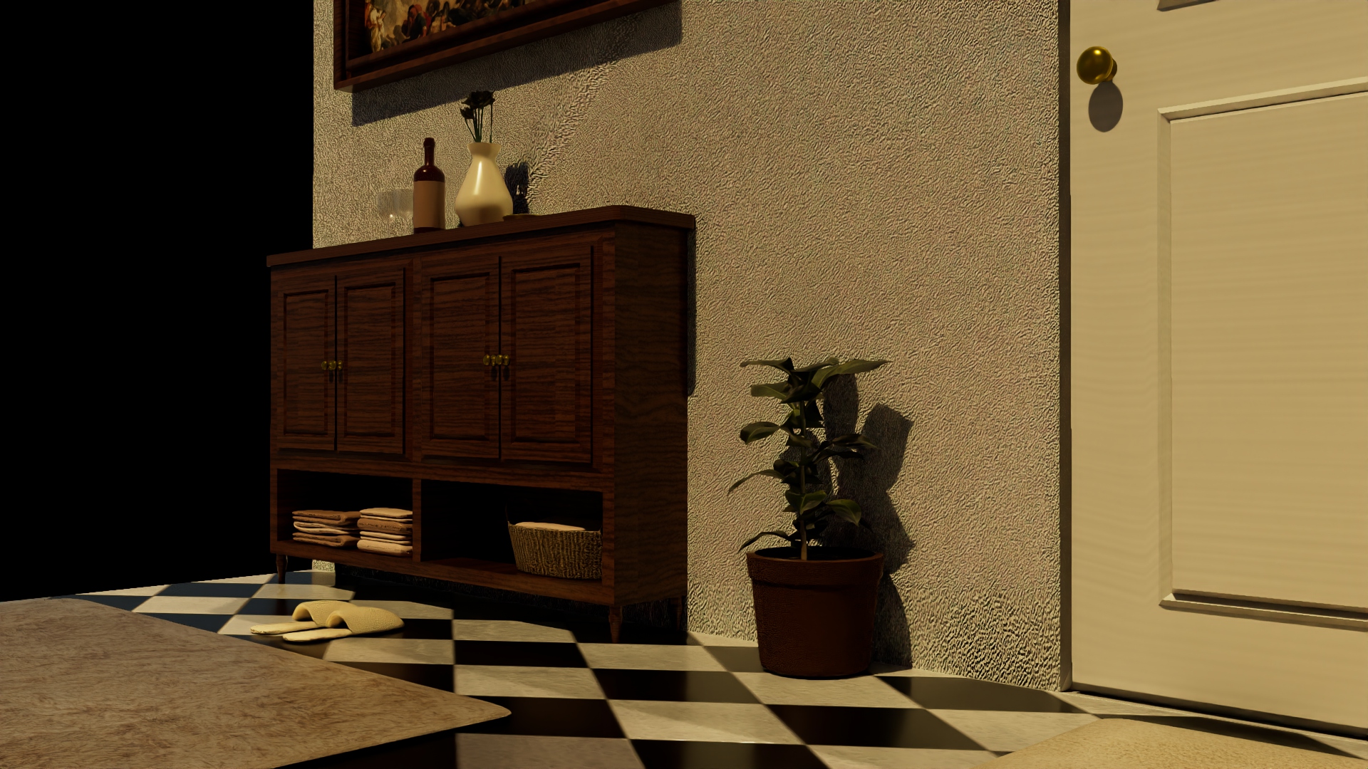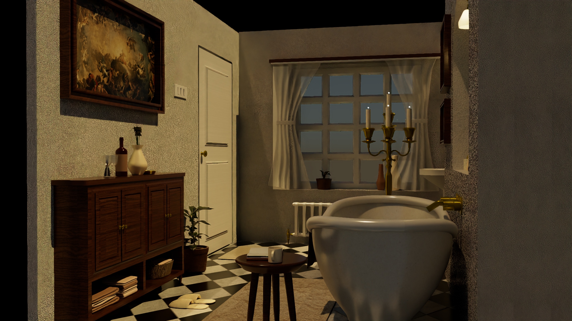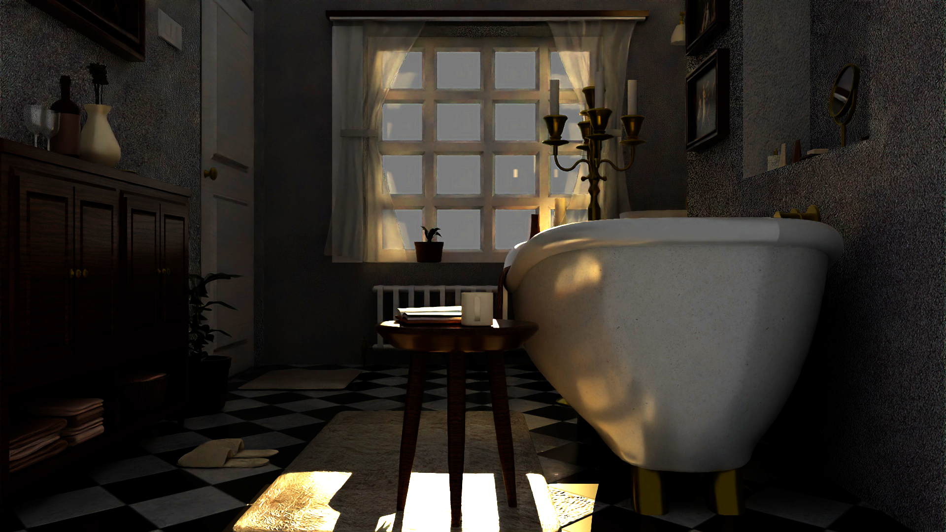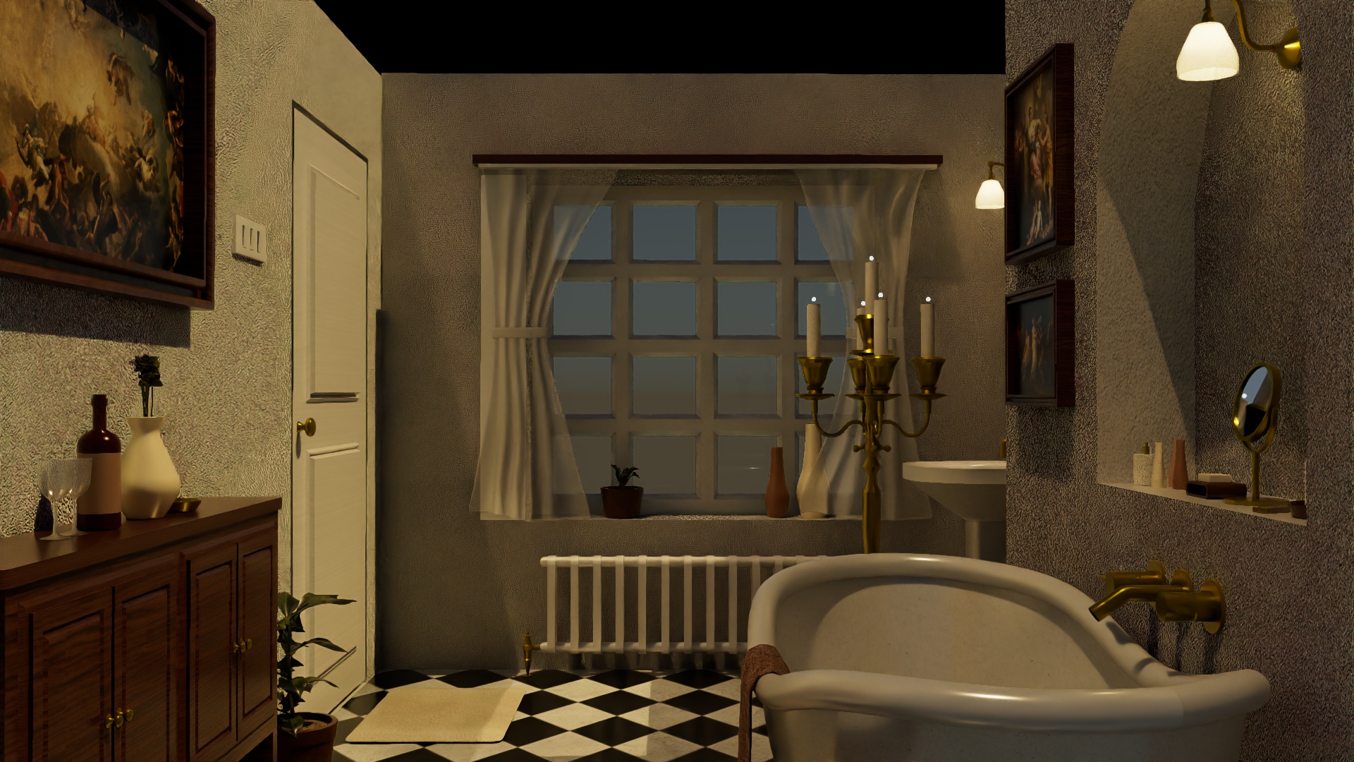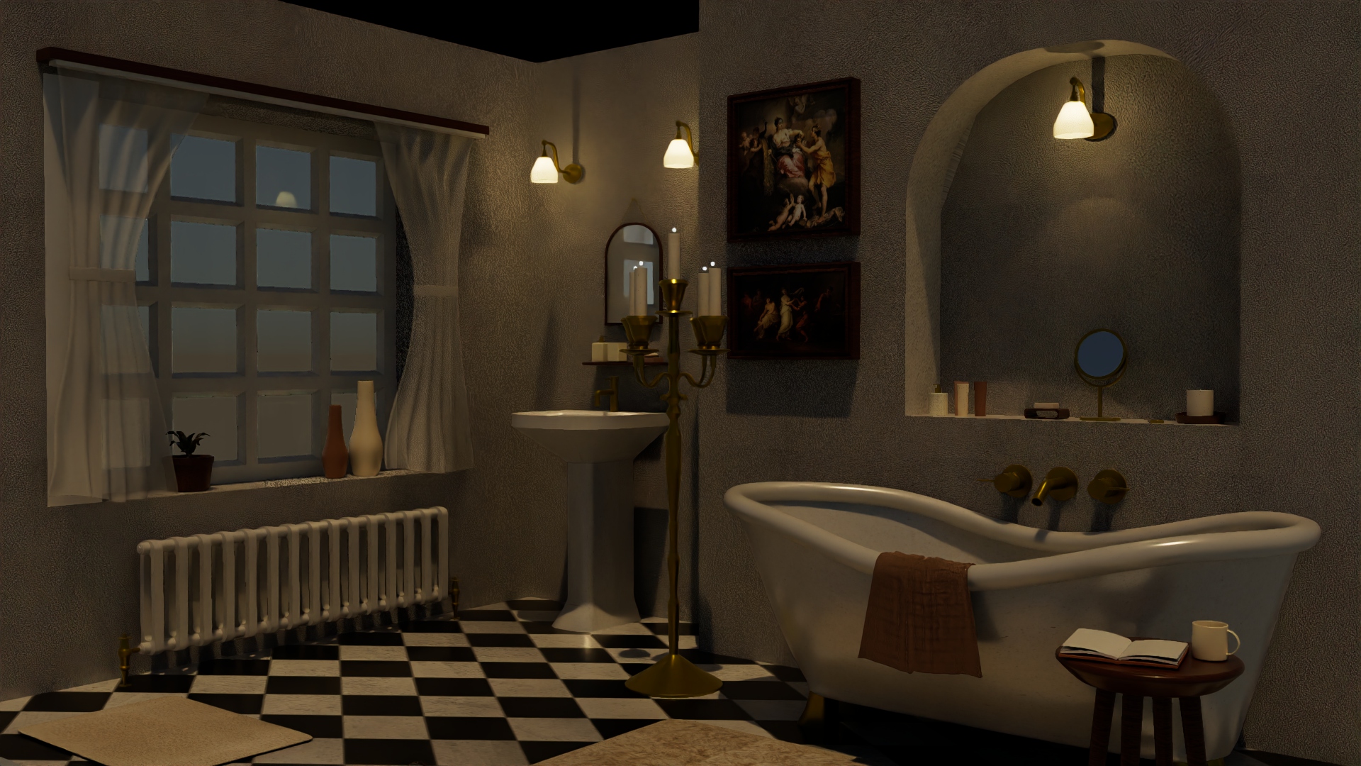 A 3D bathroom designed using Autodesk Maya, in the timeless Victorian style, incorporating hallmark design features of the era such as intricate fixtures resembling candle stands, vintage tiles, and a grand bathtub.